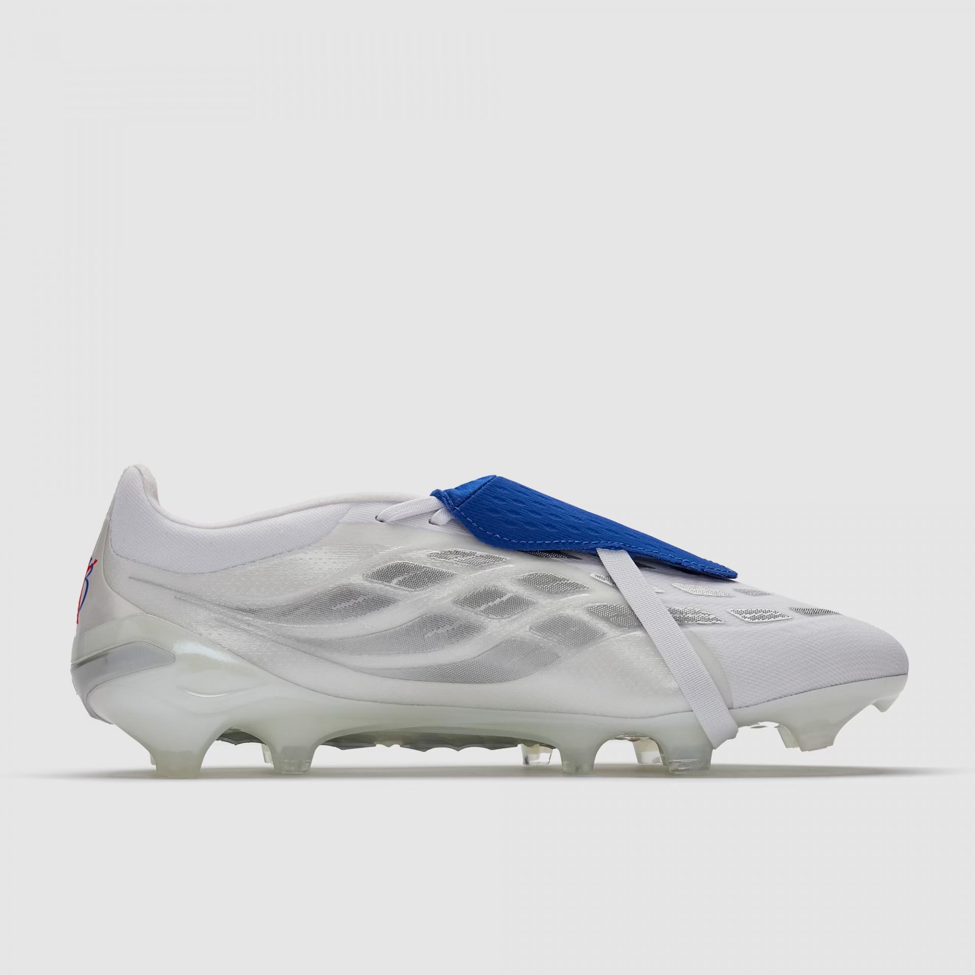 Bota Predator Pro FT FG Jude Bellingham de la marca adidas en color White-Zero Met-Team Royal Blue. Bota de gama media para campos de césped natural.