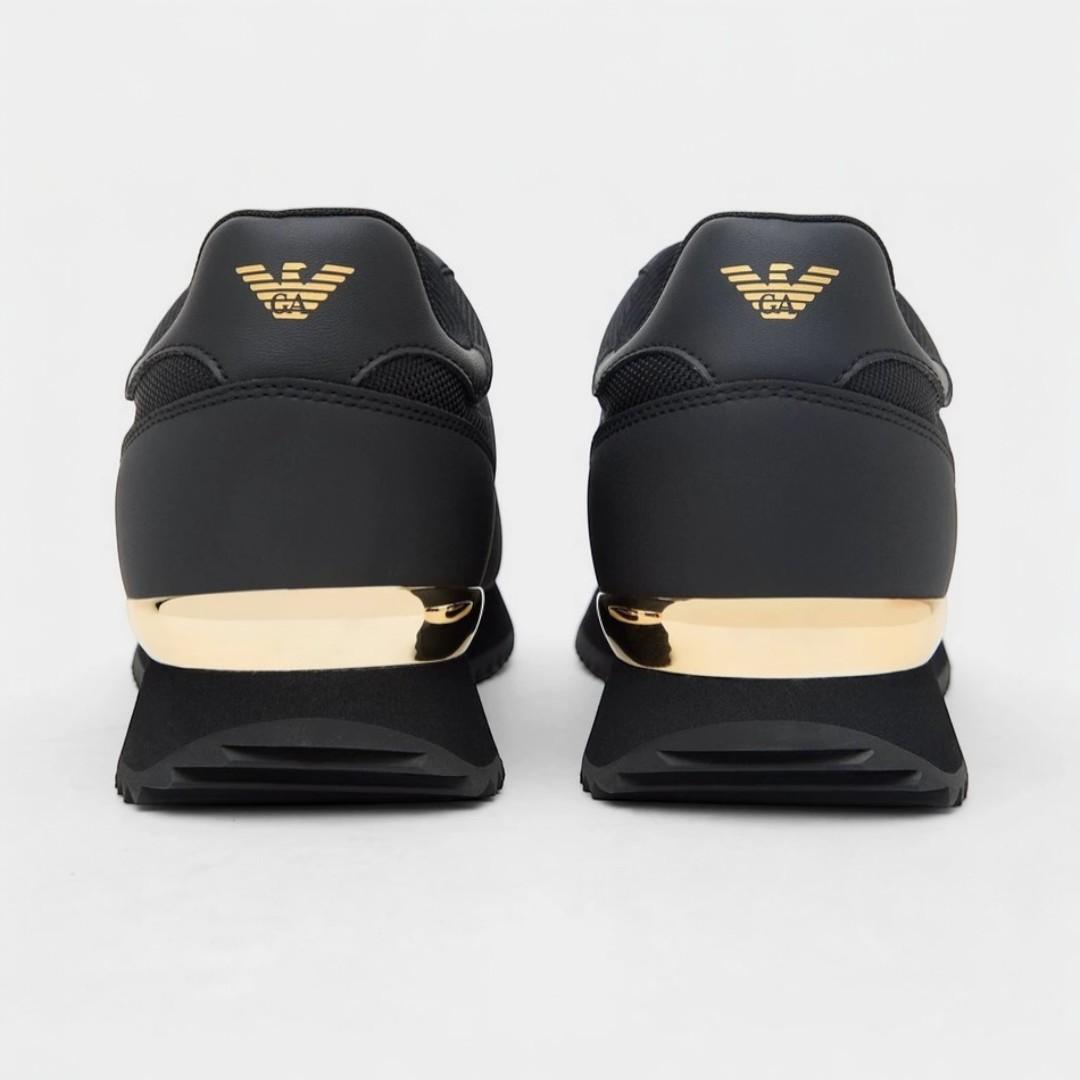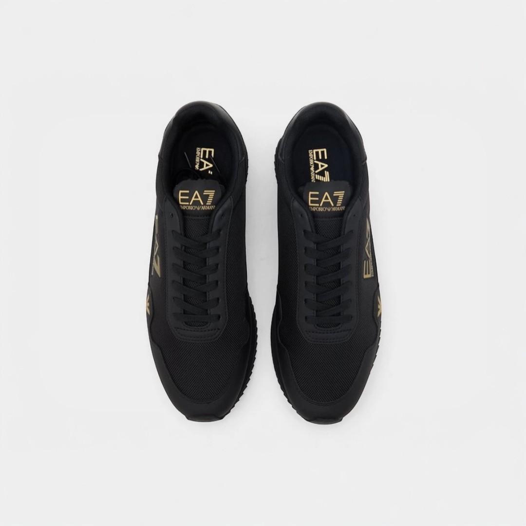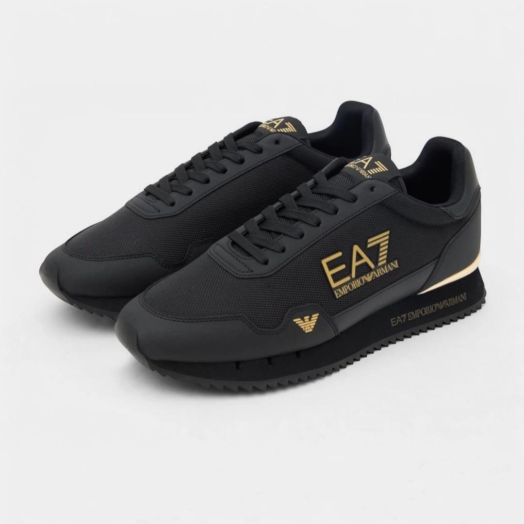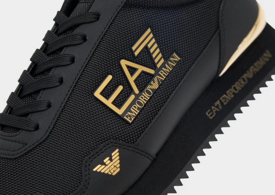 Las zapatillas EA7 Emporio Armani Vintage en color negro con detalles dorados combinan elegancia italiana y estilo urbano premium en un diseño sofisticado y moderno. Un modelo perfecto para quienes buscan destacar con un calzado exclusivo y versátil.