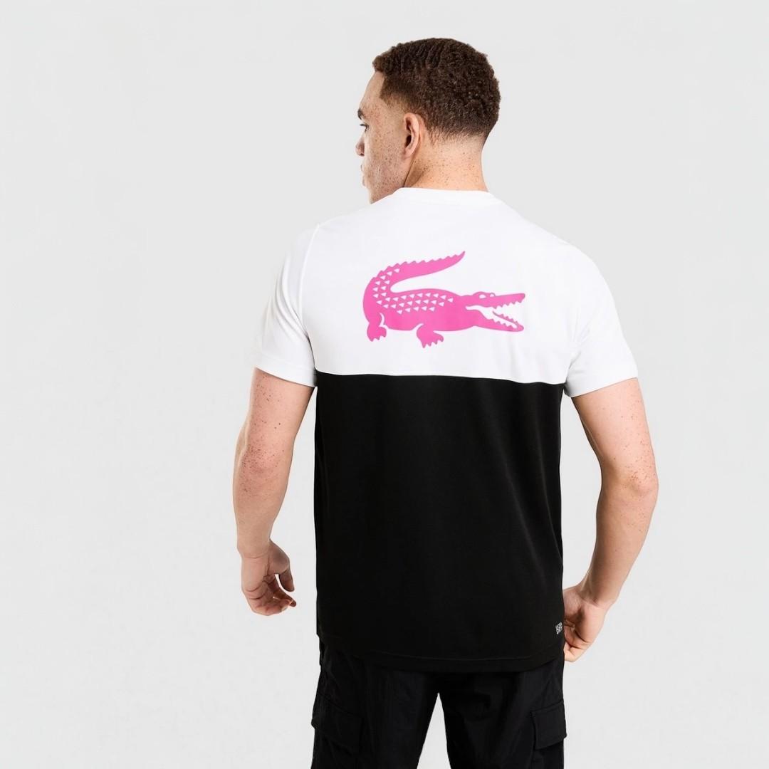 El panel superior blanco se une al bloque inferior negro para aportar equilibrio y estilo, mientras que la cinta frontal con el logo Lacoste repetido refuerza su carácter premium. En la espalda, el gran cocodrilo en color rosa añade un detalle distintivo que eleva la prenda y le aporta personalidad.