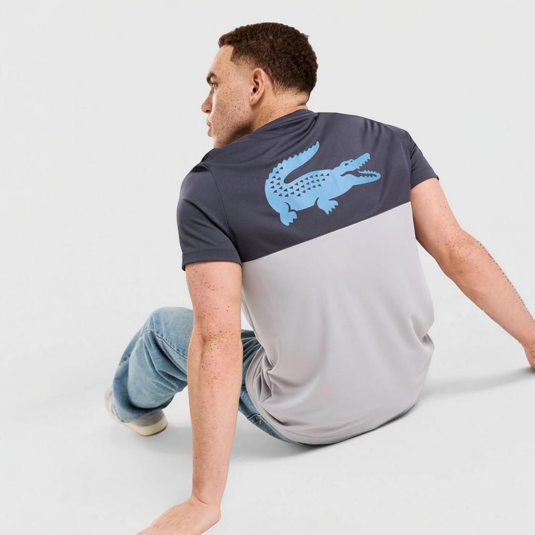 La Lacoste Camiseta Croc Colour Block Tape en gris antracita y gris claro combina diseño moderno y estética deportiva con una composición bicolor elegante y actual. Su contraste entre panel superior oscuro y bloque inferior claro aporta profundidad visual y estilo urbano.