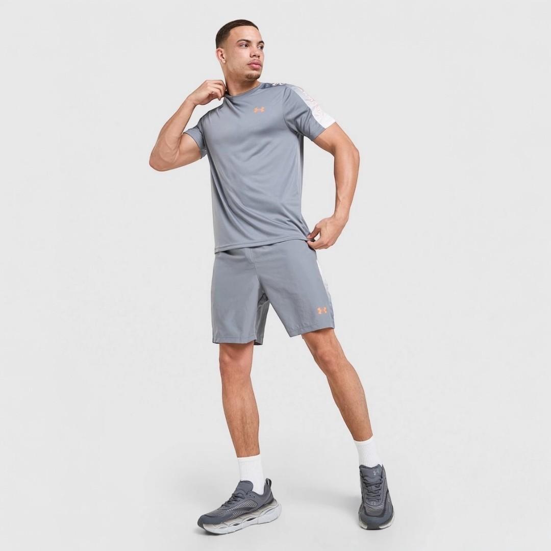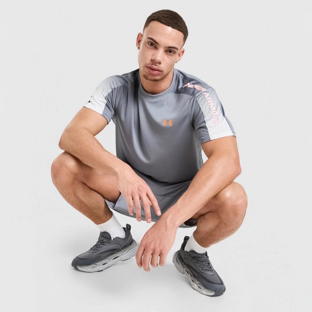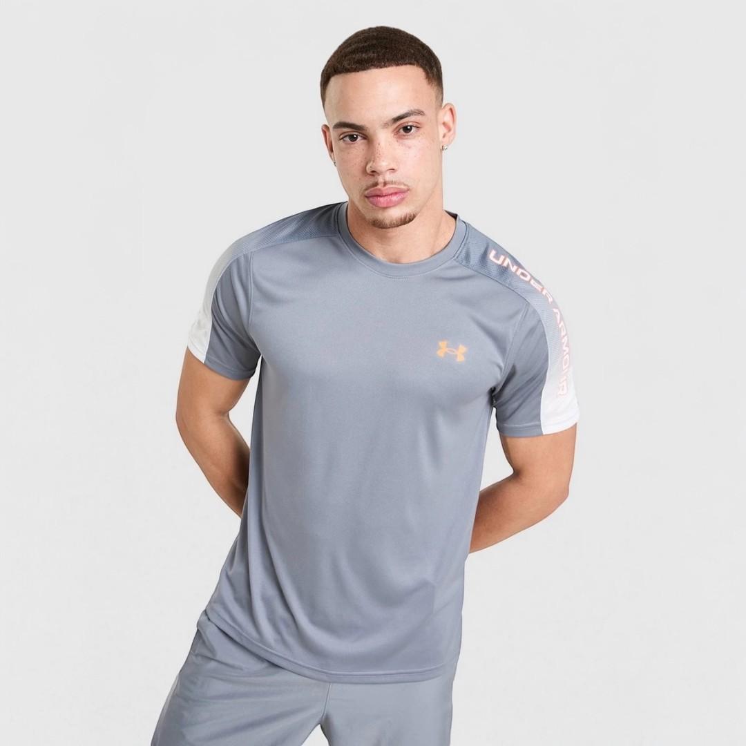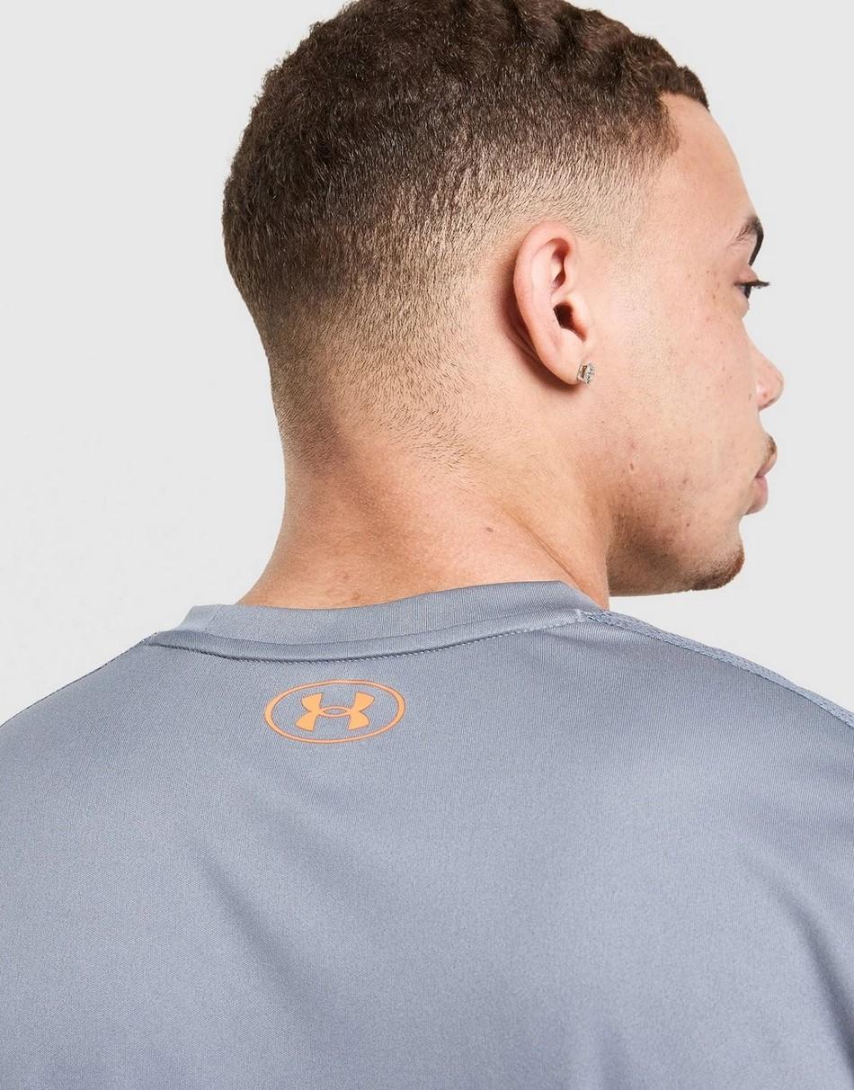 Presenta cuello redondo clásico y mangas cortas, con un corte cómodo que permite libertad de movimiento. El diseño se completa con el logotipo de Under Armour en color naranja en el pecho y la parte trasera del cuello, aportando contraste y un toque distintivo.